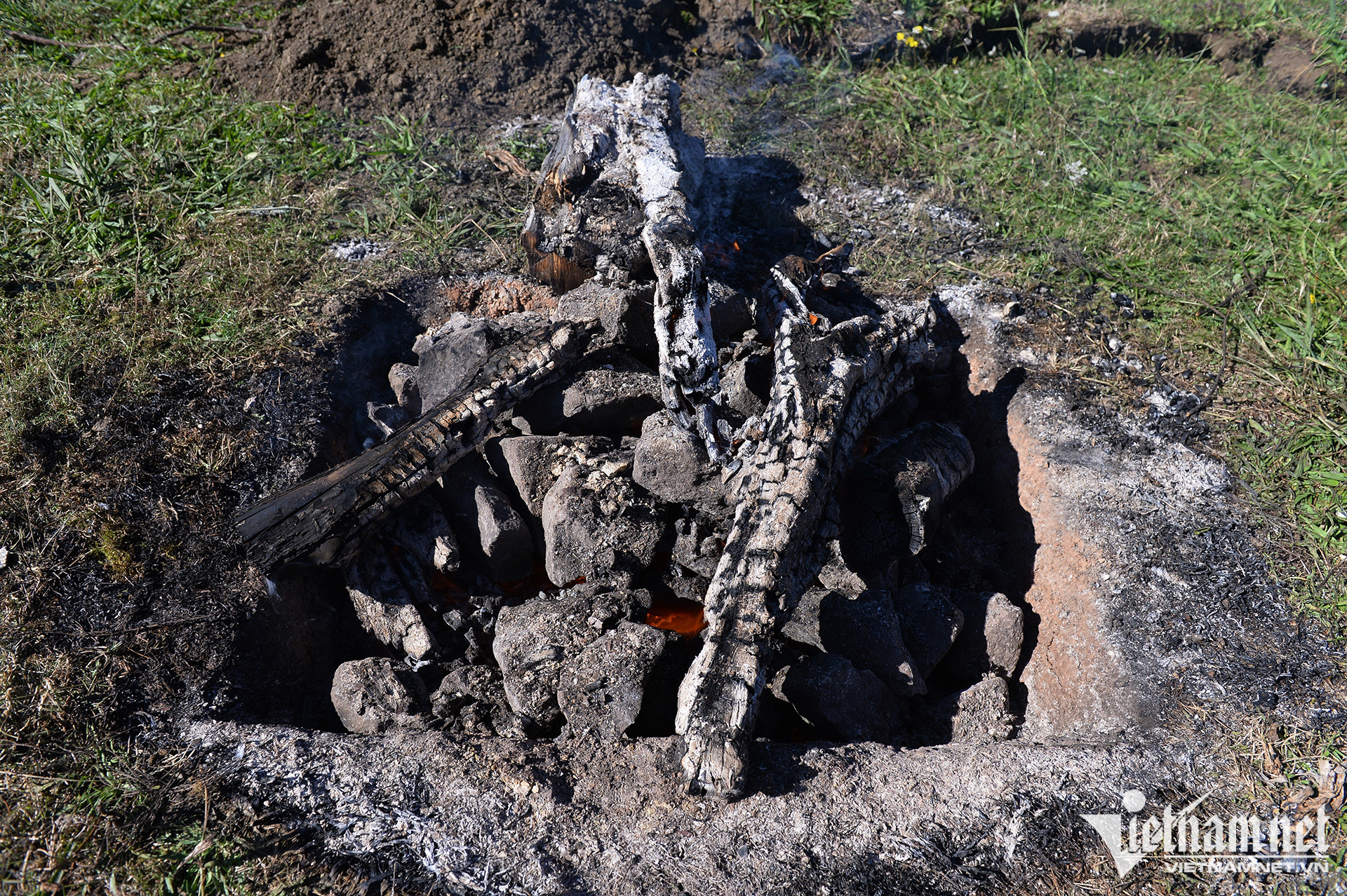 Sau khoảng 3 giờ, lớp đất được đào lên lộ ra giỏ đựng thức ăn nóng hổi.
