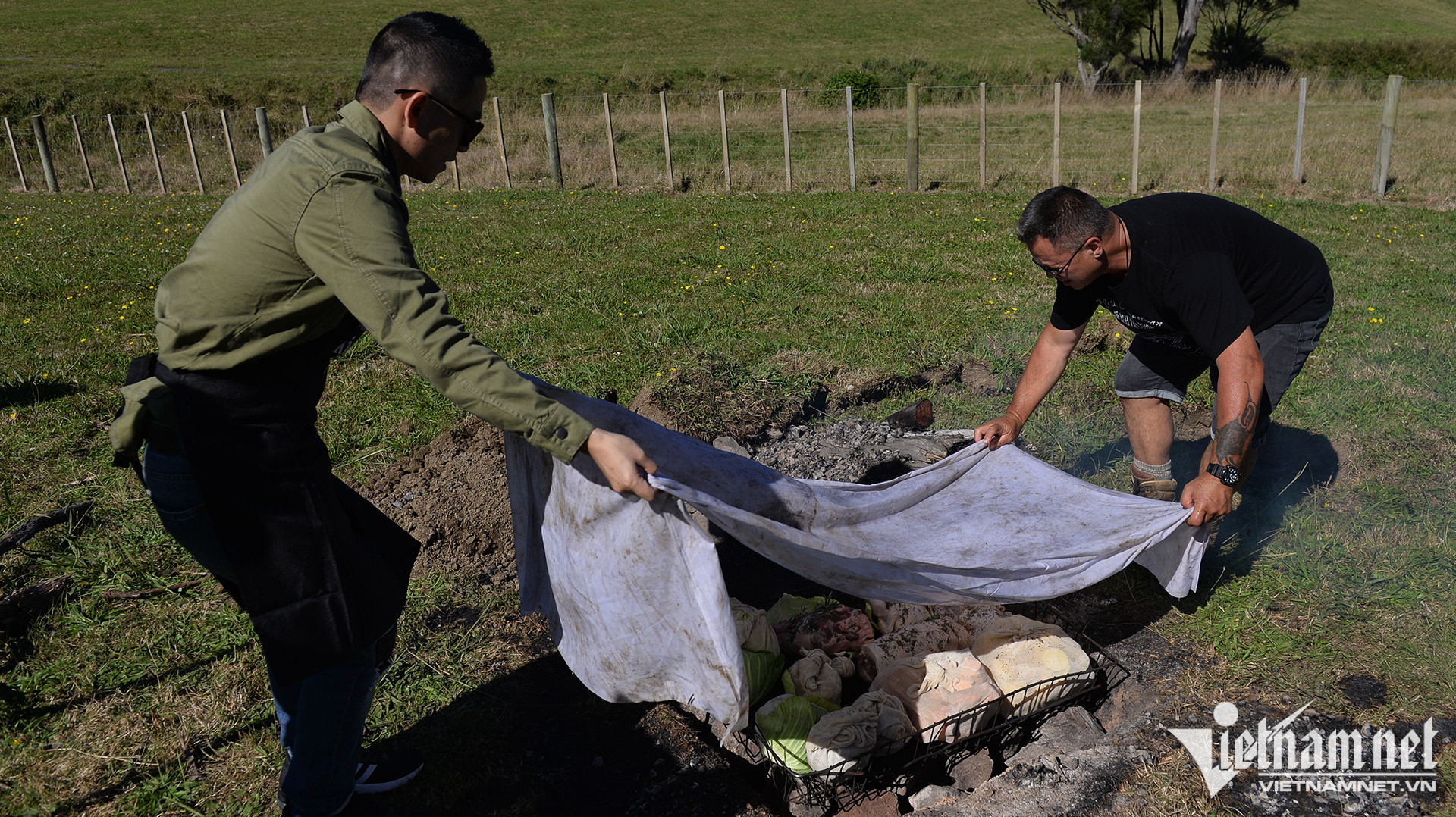 Anh Henare - người Maori chính gốc làm và giới thiệu cho du khách cách chế biến. Sau khi gà, lợn, cừu được chôn xuống dưới lớp đất, đầu bếp phủ lên đó một lớp vải dày để ủ.
