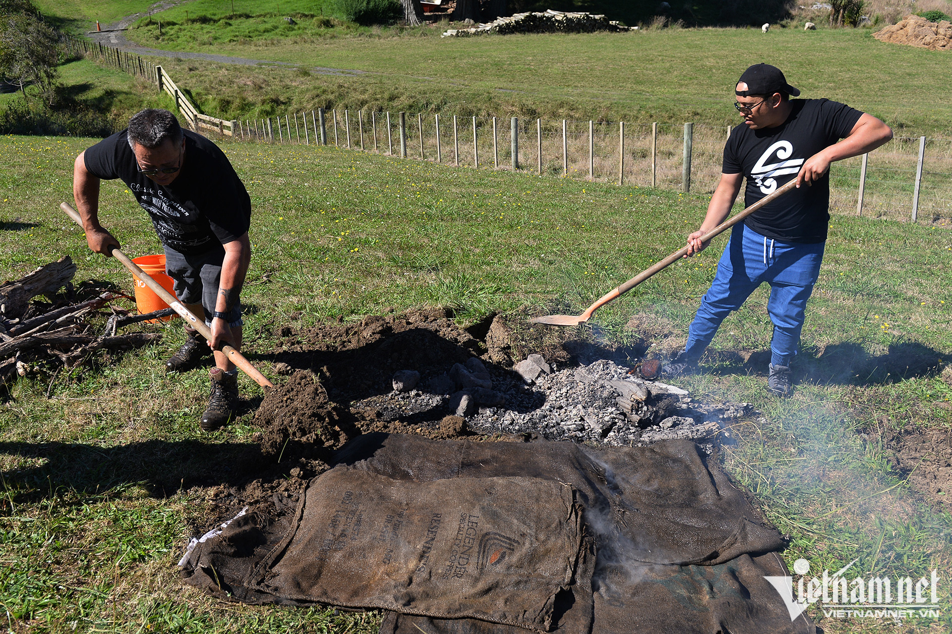 Đến du lịch New Zealand, nhiều du khách thường ấn tượng với cách chế biến thức ăn độc đáo của người Maori. Hình ảnh tại một trang trại ở khu Vineyard, Auckland, lúc này nhân viên đang đào đất để chuẩn bị cho thịt xuống nướng.
