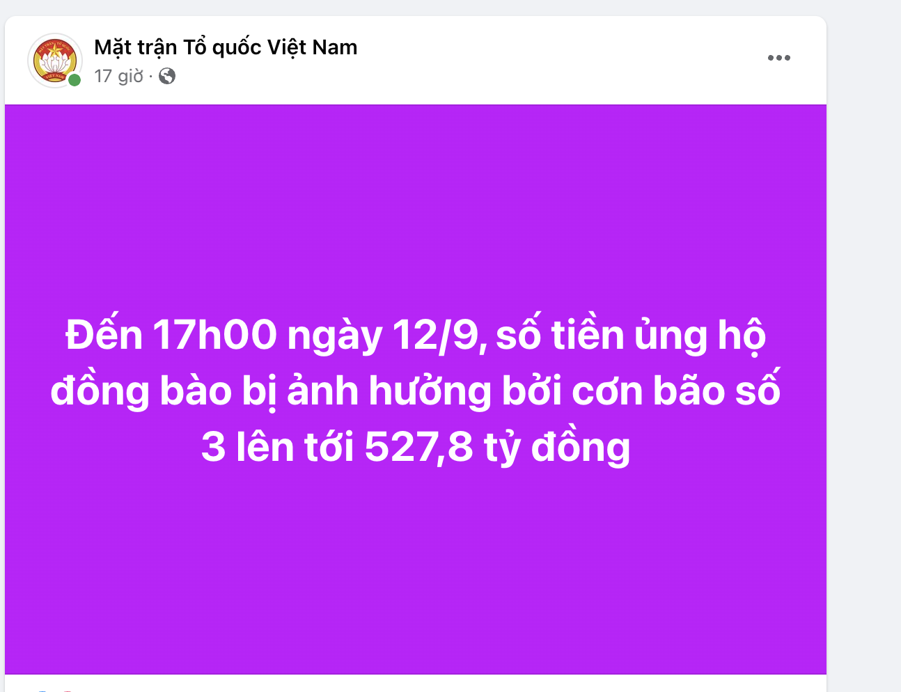 “Trân trọng cảm ơn tấm lòng của các cơ quan, doanh nghiệp, tổ chức, cá nhân ở trong và ngoài nước đã đăng ký và ủng hộ đồng bào bị ảnh hưởng bởi cơn bão số 3 thông qua Ban Vận động Cứu trợ Trung ương. Xin phép cập nhật số tiền ủng hộ qua các tài khoản dần lên trang Fanpage của MTTQ Việt Nam”, Fanpage của MTTQ Việt Nam ghi rõ.
