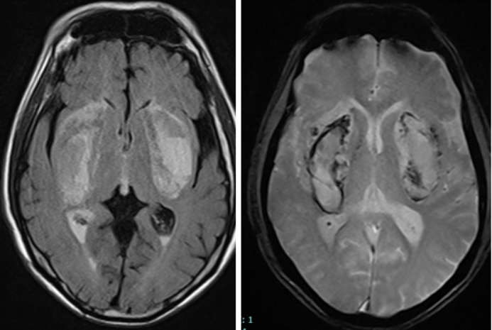 Trường hợp thứ 2, nam bệnh nhân 66 tuổi sau khi uống phải cồn pha nước lọc 1 ngày xuất hiện tình trạng đau đầu, nhìn mờ dần, vật vã kích thích. Bệnh nhân nhập viện trong tình trạng hôn mê sâu, toan chuyển hóa nặng do ngộ độc methanol. Kết quả chụp cộng hưởng từ sọ não cho thấy tổn thương nhồi máu, hoại tử, chảy máu nhân bèo hai bên - đây là dạng tổn thương não điển hình do ngộ độc methanol. Người bệnh dù được hồi sức tích cực, lọc máu, thở máy nhưng tình trạng rất nặng, nguy cơ cao đối mặt với tình trạng sống thực vật.