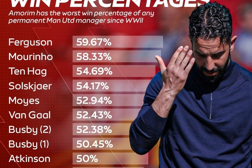 Số liệu thống kê cho thấy, Ruben Amorim là nhà cầm quân có thành tích kém cỏi nhất ở Premier League kể từ ngày ông dẫn dắt MU.