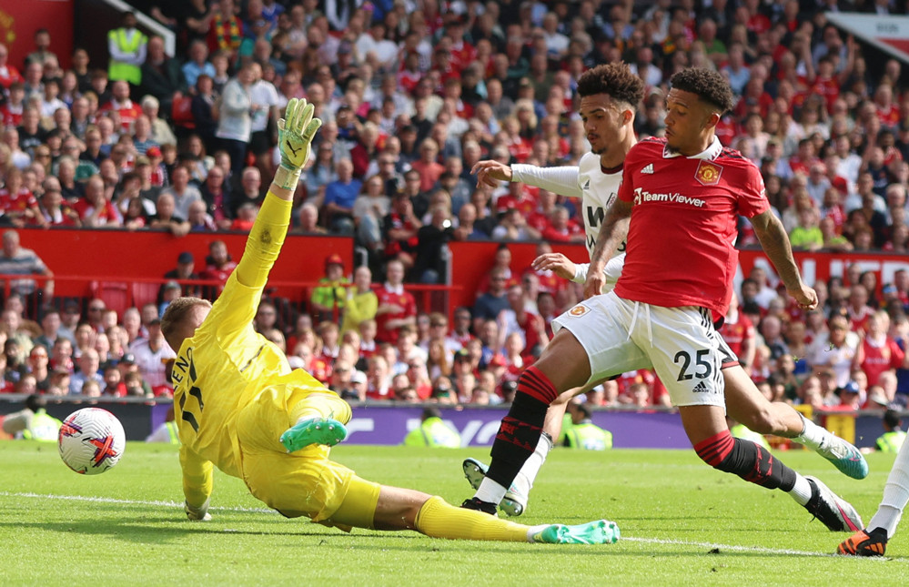 Bàn thắng (1-1, Jadon Sancho): Sau pha tả xung hữu đột của Fred trong vòng cấm, bóng đến chân Sancho ở tư thế thuận lợi. Tiền đạo người Anh vẩy má ngoài chân phải dễ dàng gỡ hòa 1-1.