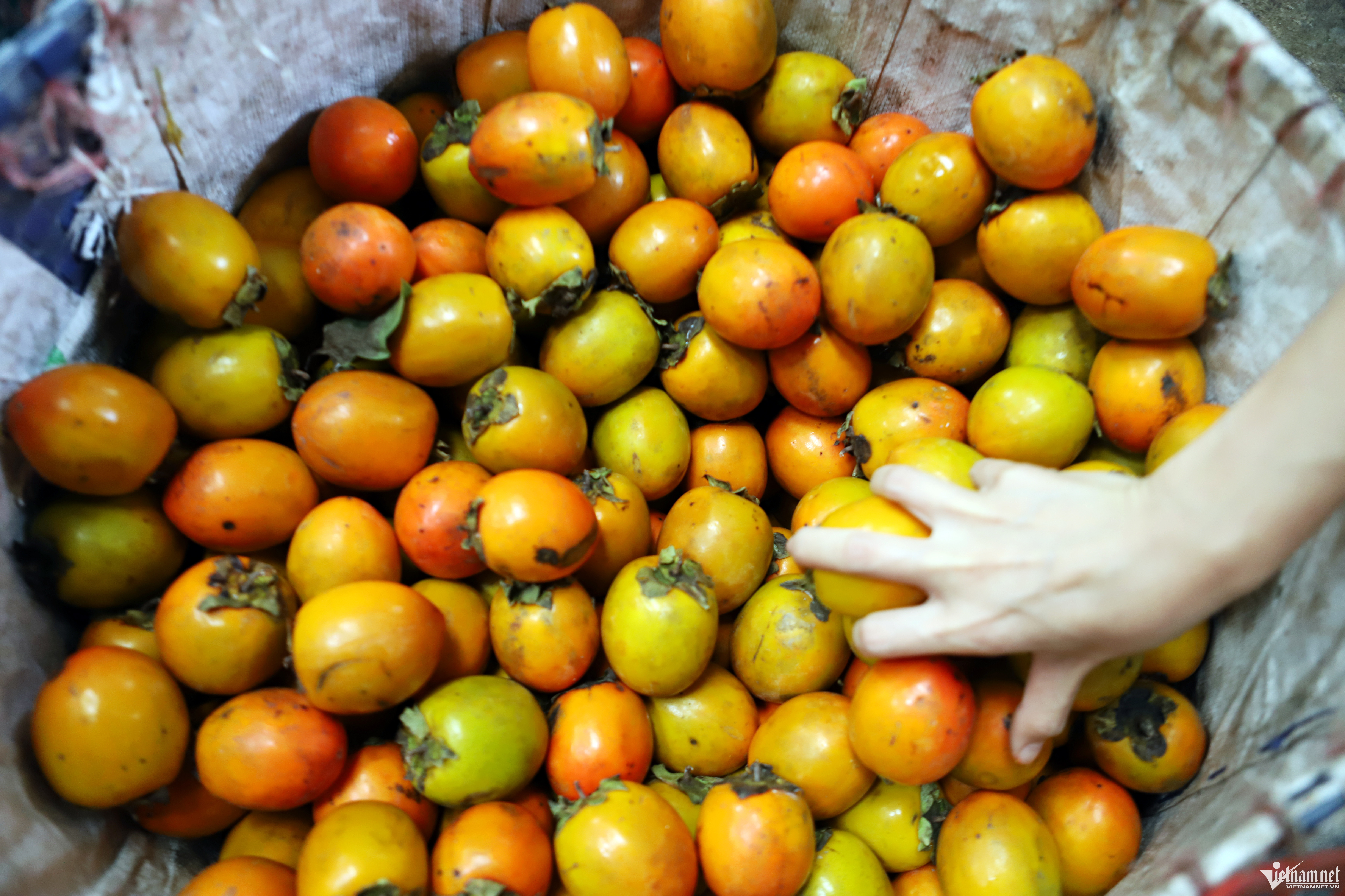 Từng trái hồng chín mọng, căng bóng hồng hào, còn cả cuống được bà Vân cùng người làm rửa sạch, phơi ráo trước khi sơ chế làm hồng treo gió. "Lúc chăm sóc, vườn hồng tuyệt đối không được sử dụng chất tăng trưởng, vì trái sẽ dễ rụng và hỏng", bà Vân nói.