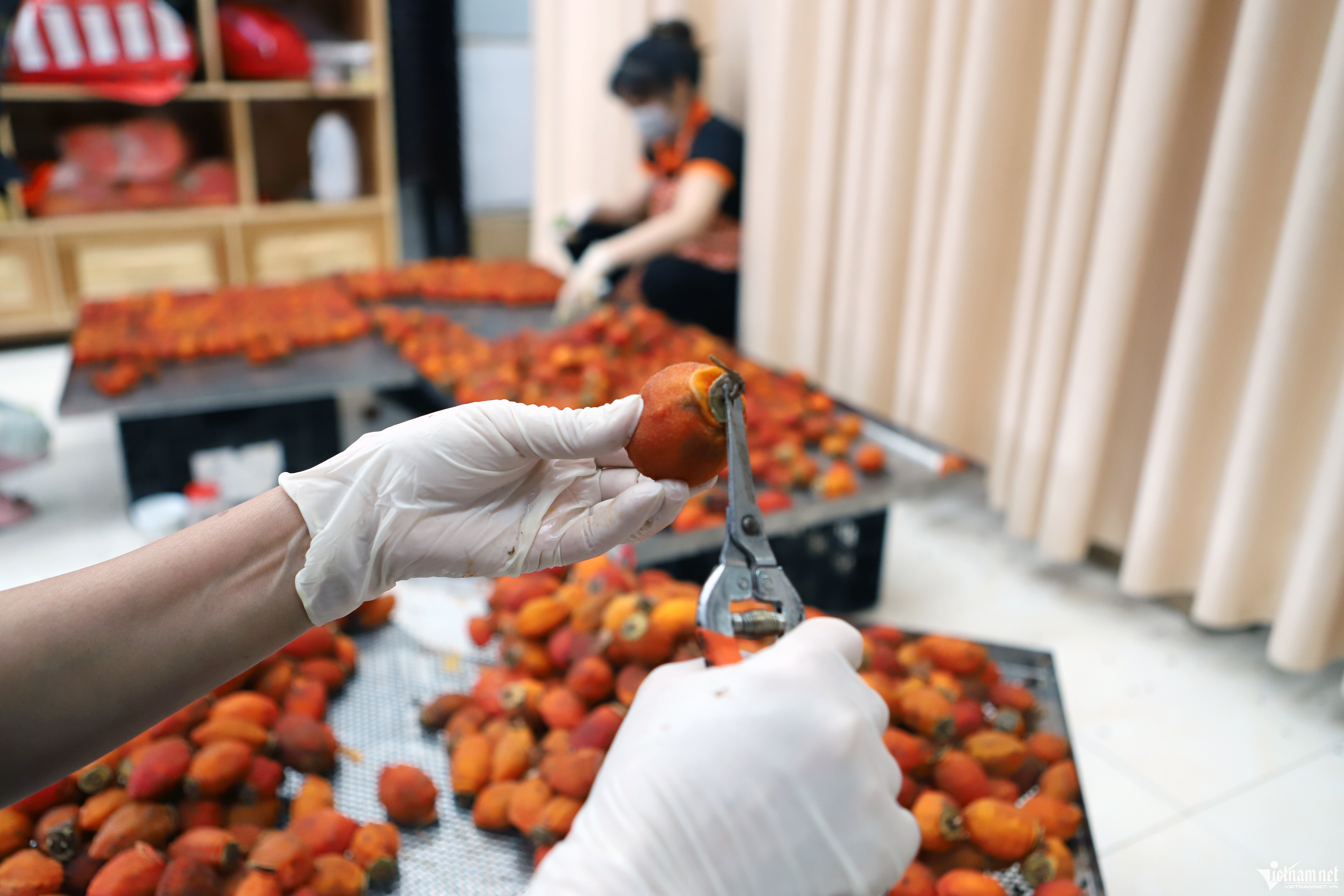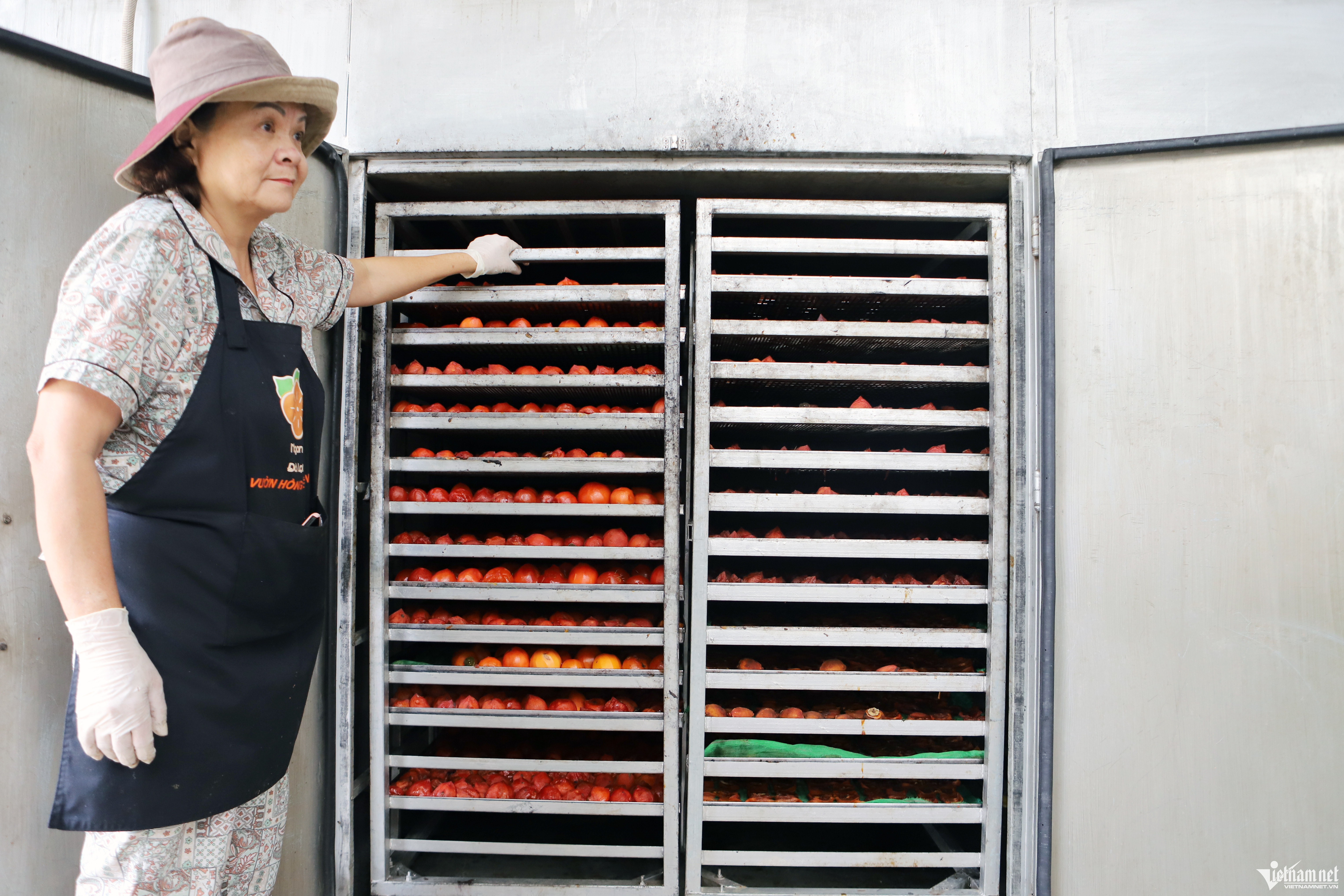 Bà Vân cho hay, trước khi treo hồng phải được sấy khô trong lò khoảng 3 tiếng ở nhiệt độ 50 - 60 độ C. Công việc này trải qua nhiều công đoạn, phải chọn những trái hồng già, cứng, còn cuống và không bị dập để treo. Từng trái hồng sau đó được kẹp gắn tách biệt treo thành dây, không sử dụng chất bảo quản nào và nhờ gió sấy tự nhiên.