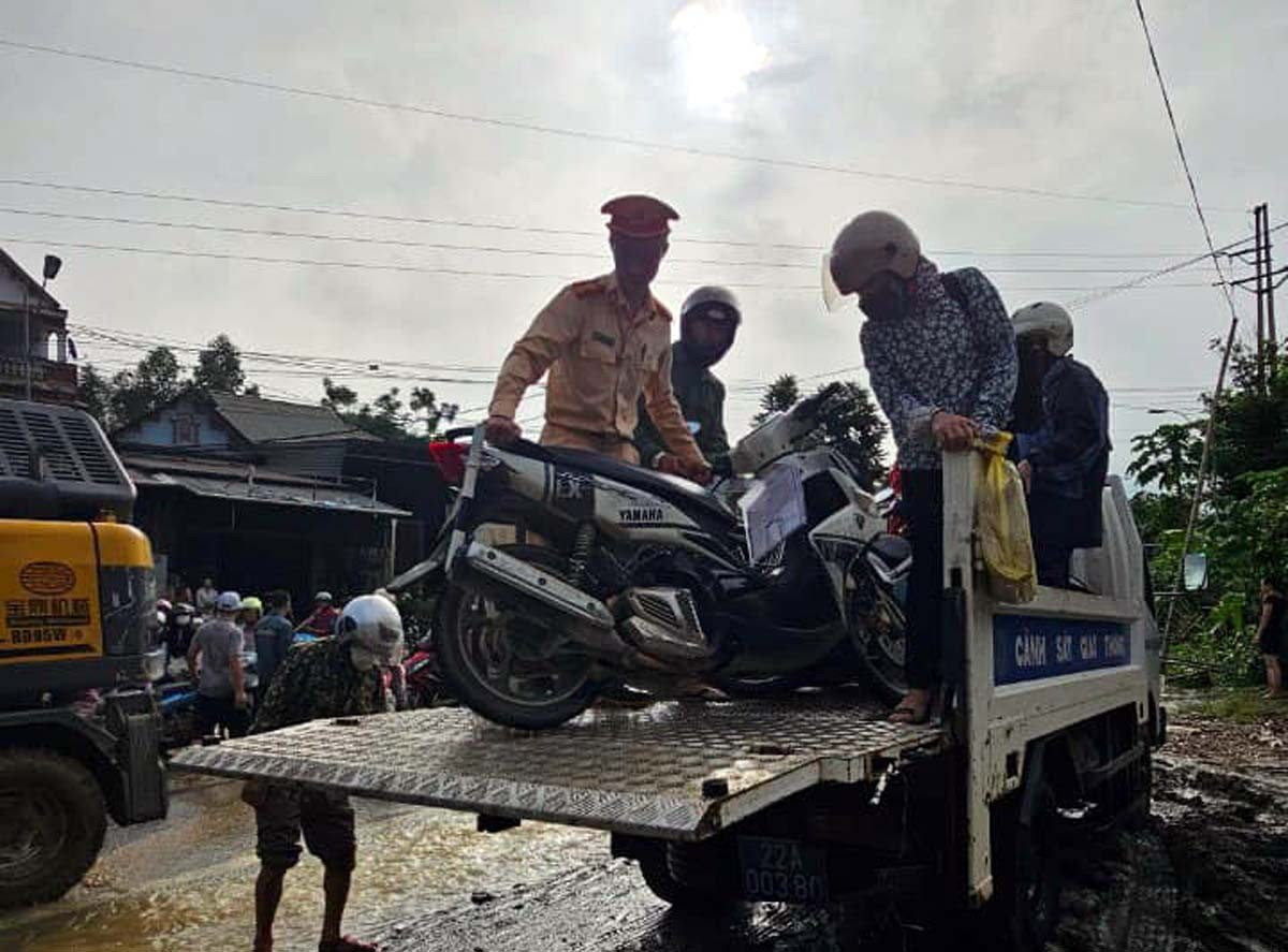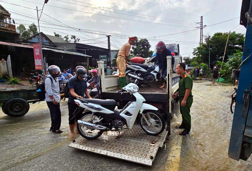Đồng thời sử dụng xe chuyên dụng của lực lượng CSGT để đưa người dân cùng phương tiện, hàng hoá đi qua vùng ngập nước thuận lợi, đảm bảo tuyệt đối an toàn về sức khoẻ và tài sản cho người tham gia giao thông.