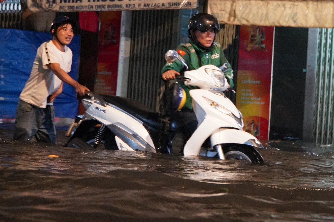 Hơn 19h30 tối 23/10, hàng loạt tuyến đường ở quận Bình Tân (TP.HCM) như An Dương Vương, Nguyễn Thức Đường, Kênh Nước Đen, Hồ Học Lãm,... vẫn ngập sâu.