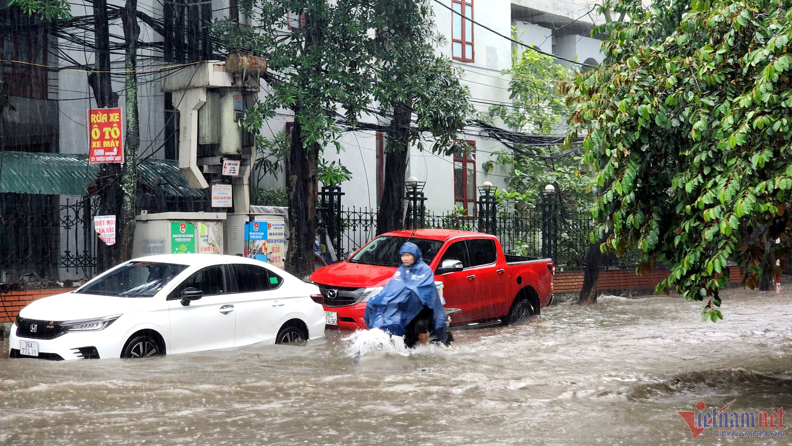 Ghi nhận của PV VietNamNet, đến khoảng 11h trưa nay (27/9), trên địa bàn TP Thanh Hóa trời vẫn mưa to. Hàng loạt các tuyến đường, phố như: Ngã tư Lê Lợi, đường Phan Chu Trinh, Trường Thi, Triệu Quốc Đạt, Trần Phú... ngập sâu cả nửa mét.