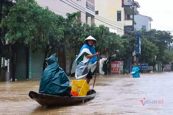 Lũ tràn nghìn ngôi nhà ở Quảng Bình, dân dùng thuyền đi lại trên phố