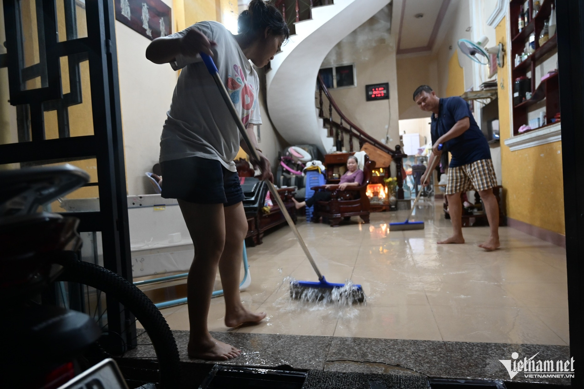 Người dân xoay sở đẩy nước ngập ra khỏi nhà.