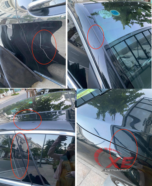 | Vị trí các vết xước trên xe trên xe sau khi ô bất ngờ xụp xuống và khung đỡ cào vào vỏ xe. |