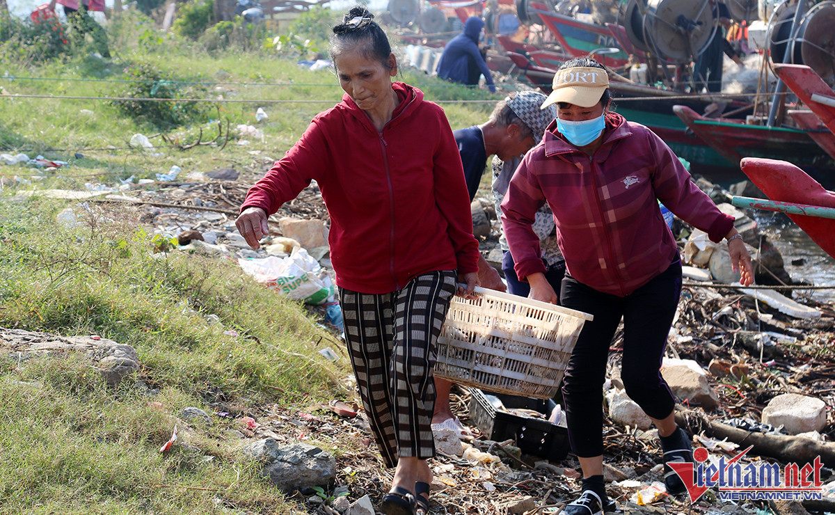 Những tay lưới còn mắc đầy ghẹ, tôm tít, cá… nhanh chóng được những người phụ nữ gỡ ra. Thoăn thoắt như một công việc quen thuộc, các chị gỡ ghẹ, tôm tít, cá vướng lưới rất nhanh mà không làm gãy càng hay tróc vảy, bể bụng.