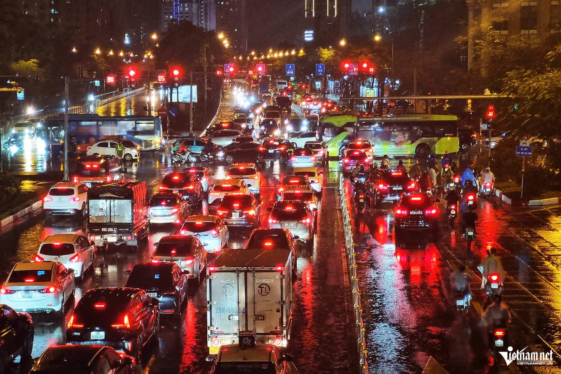Dòng ô tô xếp hàng dài lúc nửa đêm để chờ vượt qua điểm ngập úng trên đường Võ Chí Công.