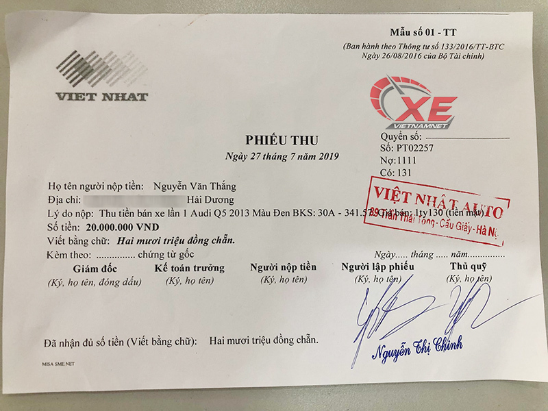 Sau một thời gian tìm kiếm, anh Thắng quyết định mua chiếc Audi Q5 đời 2013 màu đen tại showroom ô tô Việt Nhật, số 89 Trần Thái Tông, Cầu Giấy (Hà Nội) với giá 1,13 tỷ đồng. Anh đặt cọc trước 20 triệu đồng vào ngày 27/7/2019 với cam kết nếu quá ngày 10/8/2019, không thực hiện giao dịch sẽ mất tiền cọc. Trong Thỏa thuận mua bán xe, đại diện showroom cũng ghi cam kết “chiếc xe máy móc nguyên bản, không đâm đụng, không ngập nước”.
