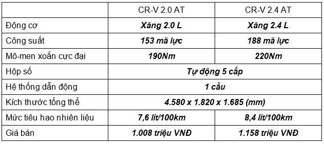 Honda CR-V có thể coi là biểu tượng của phân khúc này khi liên tục nhiều năm trong Top những chiếc xe bán chạy nhất Việt Nam sau khi bị thay thế bởi Mazda CX-5. Tuy nhiên mẫu xe này có nhiều lựa chọn khi đưa ra thị trường 2 phiên bản động cơ khác nhau đi cùng hệ thống dẫn động 1 cầu chủ động.
