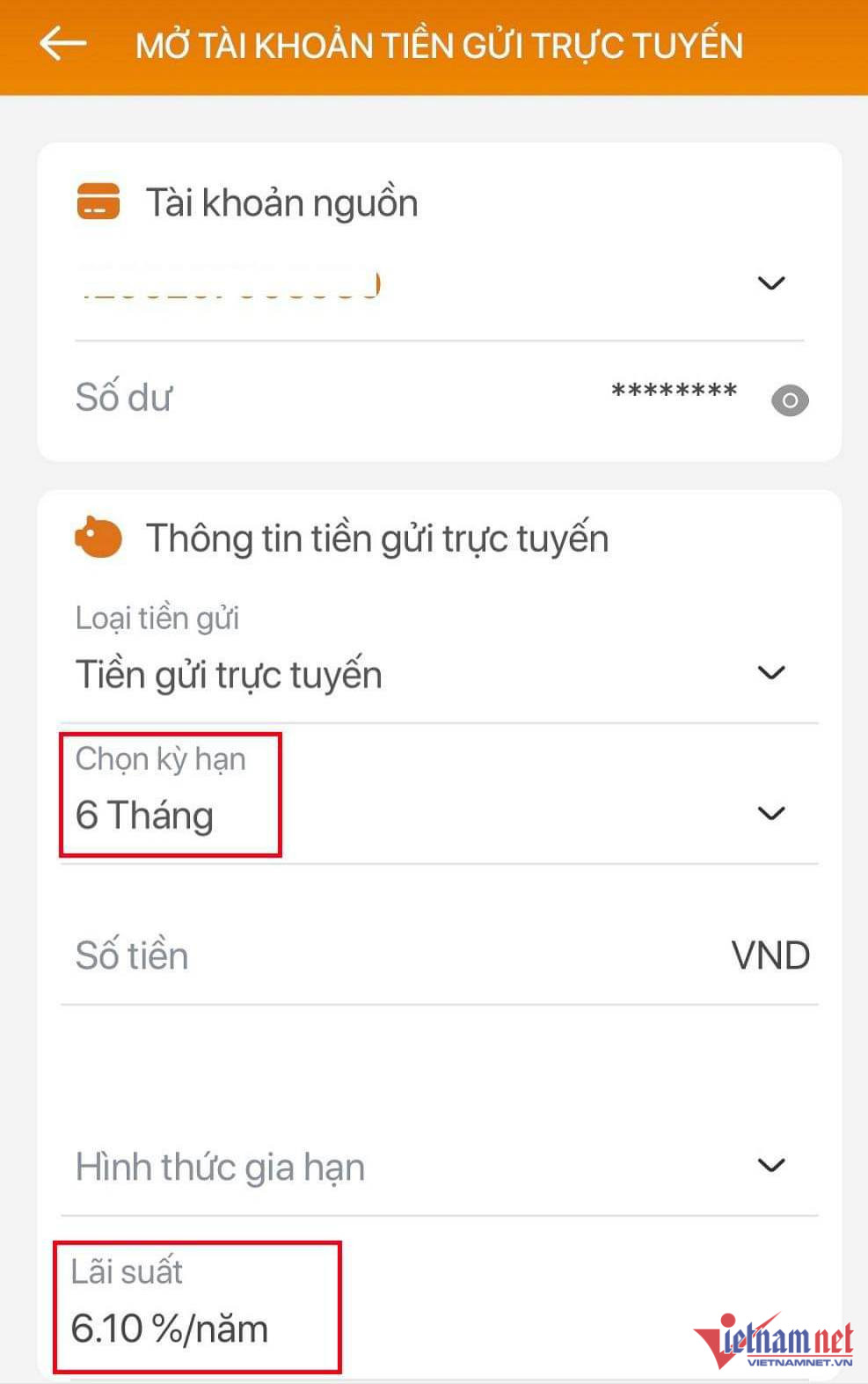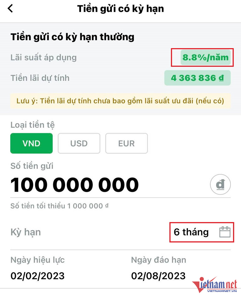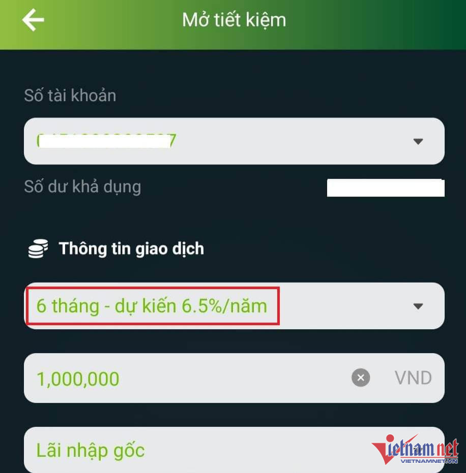 Trong khi đó, Ngân hàng TMCP Ngoại thương Việt Nam (Vietcombank) công bố trên website lãi suất kỳ hạn 6 tháng ngày 2/2 là 6%/năm. Tuy nhiên, lãi suất thực tế ngân hàng trả cho khách hàng là 6,5%/năm. Mức lãi thực tế này được hiển thị ngay trên ứng dụng VCB khi khách hàng thực hiện gửi tiết kiệm online.