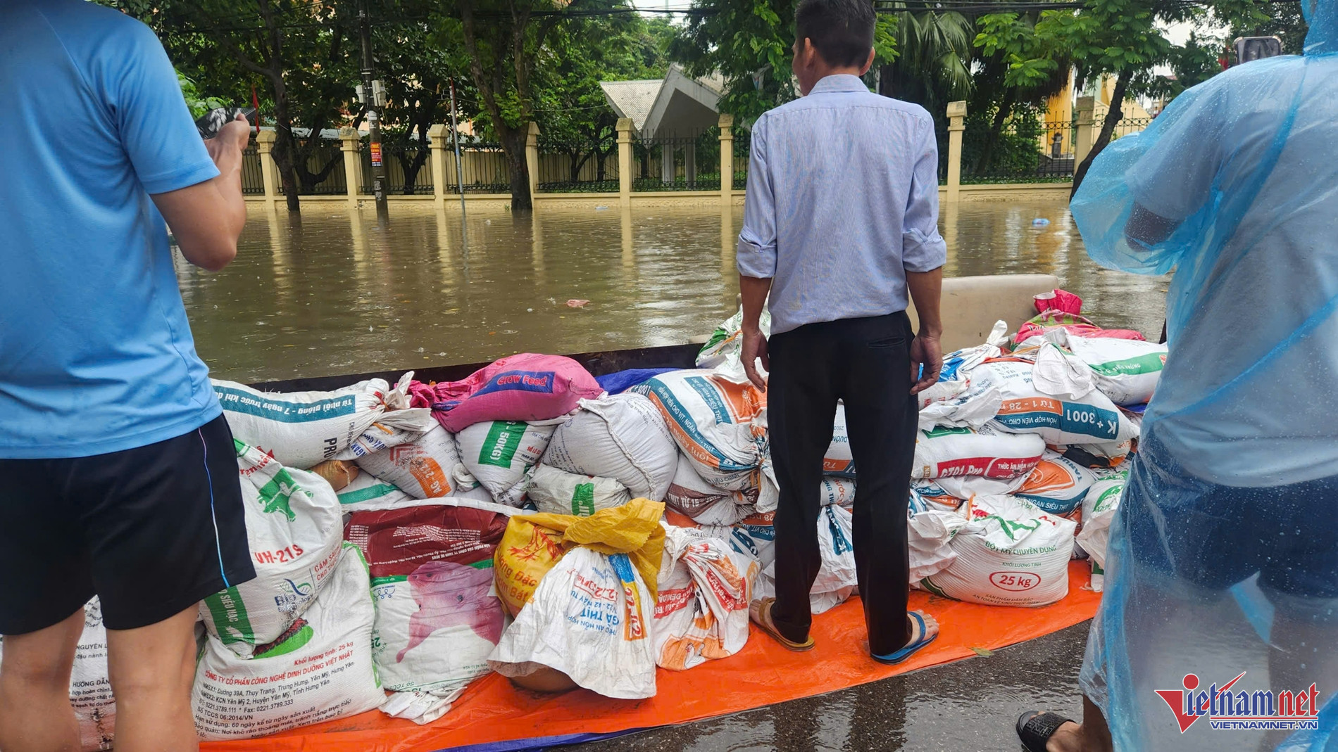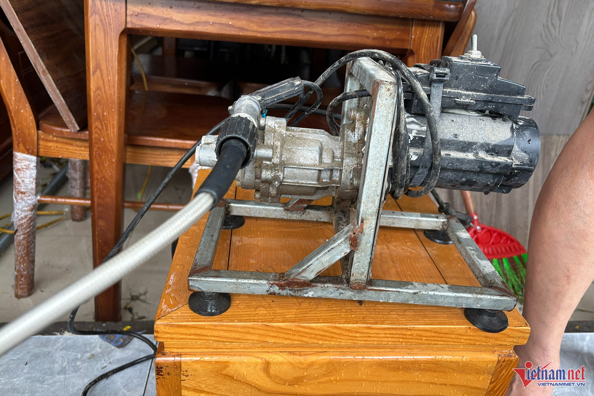 Vừa ăn bát mì, vừa trông máy bơm nước, anh Nguyễn Minh (ở số 554 Nguyễn Trãi) chia sẻ: “Gia đình phải dùng hai máy bơm để hút nước từ trong nhà ra ngoài. Lần này ngập nặng hơn hôm 30/9".