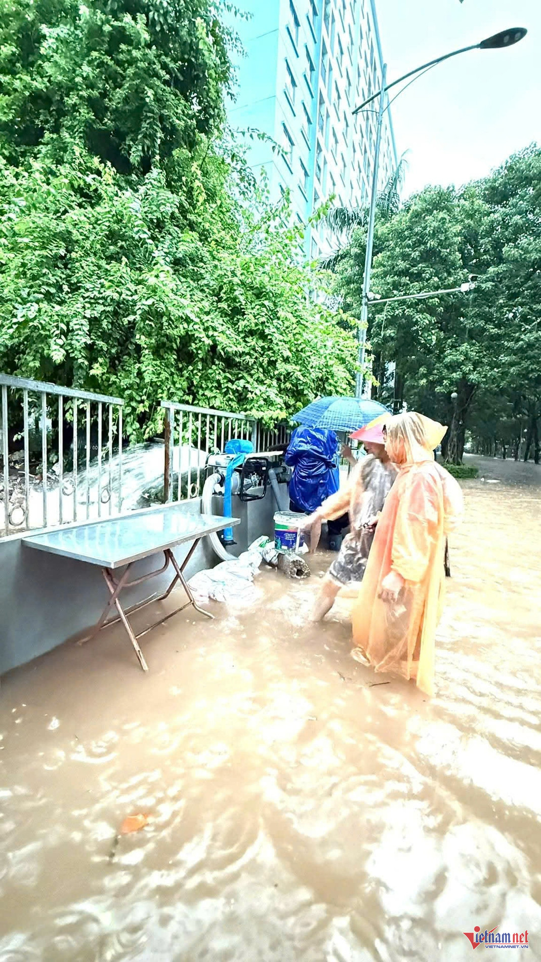 Tại khu chung cư Ecohome 1 (phường Đông Ngạc), tình hình đặc biệt nghiêm trọng. Cơn mưa lớn khiến toàn bộ lối ra vào bị ngập sâu, có điểm nước dâng gần 1m, cô lập cả khu vực.