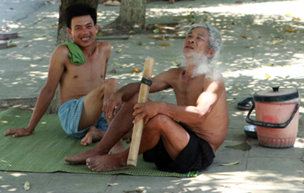 Dưới các tán cây, những người đàn ông tận dụng phút thảnh thơi trò chuyện.
