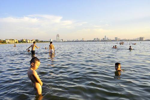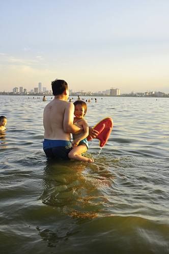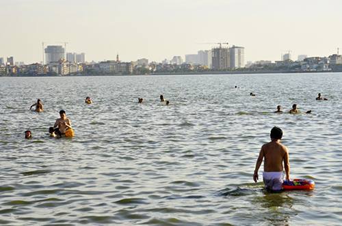 Hồ Tây những ngày nắng trở thành "bãi biển" của Thủ đô.