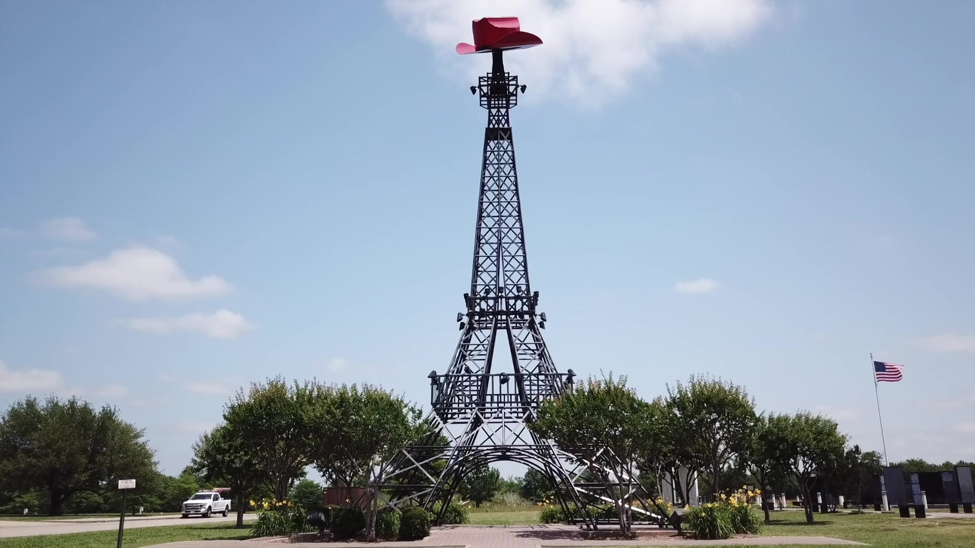 'THÁP EIFFEL' - TEXAS, MỸ: Nằm ở thành phố mang tên Paris của bang Texas, công trình kiến trúc cao 20m này được gắn thêm một chiếc mũ cao bồi màu đỏ vui nhộn trên đỉnh. Nó được xây dựng vào năm 1993 và cũng được chiếu sáng bởi nhiều bóng led vào ban đêm như bản gốc.