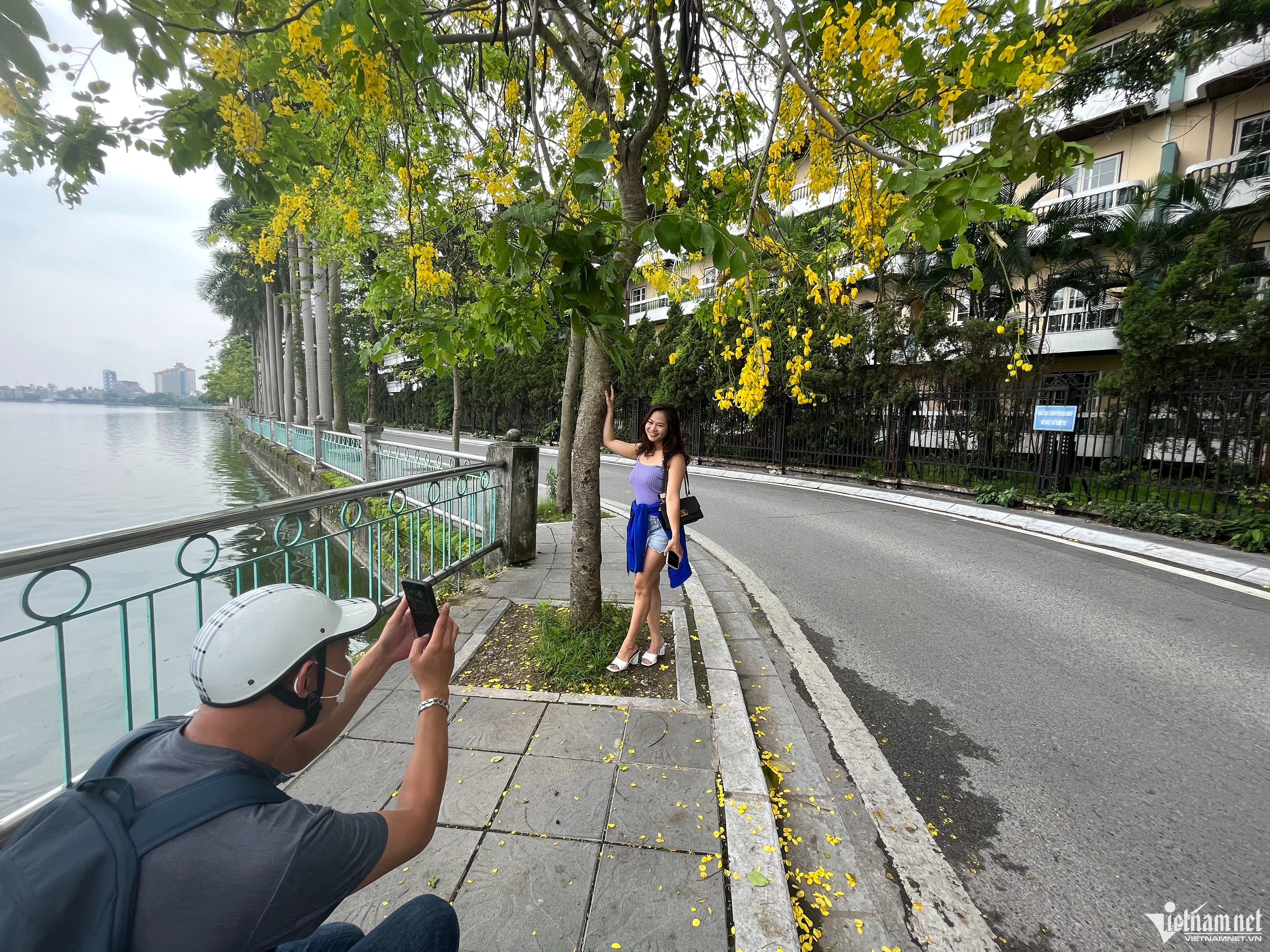 Anh Nguyễn Quốc Việt (Đống Đa), cùng với vợ của mình đi dạo một vòng Hồ Tây. Đi qua cây Muồng hoàng yến thấp cành, anh vội vàng dừng lại để chụp cho vợ mình những bức ảnh check-in rực rỡ.