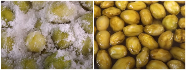 Bước 1: Cóc to gọt bỏ vỏ, bổ miếng nhỏ múi cau (bỏ hạt). Cho cóc vào âu nước có pha 1 thìa canh muối. Ngâm cóc trong nước muối loãng khoảng 30 phút. Sau đó vớt cóc ra, rửa sạch lại và để ráo nước hoàn toàn.