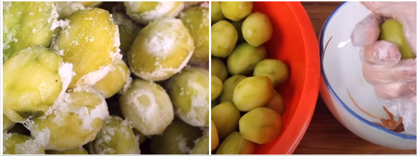 Bước 2: Lấy cóc ra khỏi ngăn đá, để giã đông 2 tiếng. Sau đó vắt nước trong quả cóc (công đoạn vắt nước này giúp mứt cóc không bị chua quá).