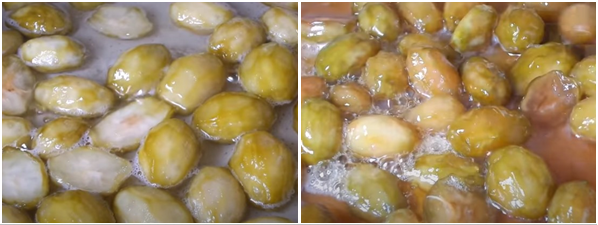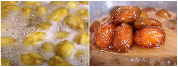 Bước 5: Đổ toàn bộ cóc và nước đường vào chảo, bật bếp đun sôi thì hạ lửa nhỏ. Thỉnh thoảng đảo nhẹ cho đường ngấm vào cóc. Vắt nước cốt 1 quả chanh vào và đảo nhẹ. Sên cho đến khi thấy cóc có màu đỏ đỏ, nước đường có màu vàng cánh gián thì tắt bếp (nếu sên lâu quá thì cóc sẽ bị đắng).