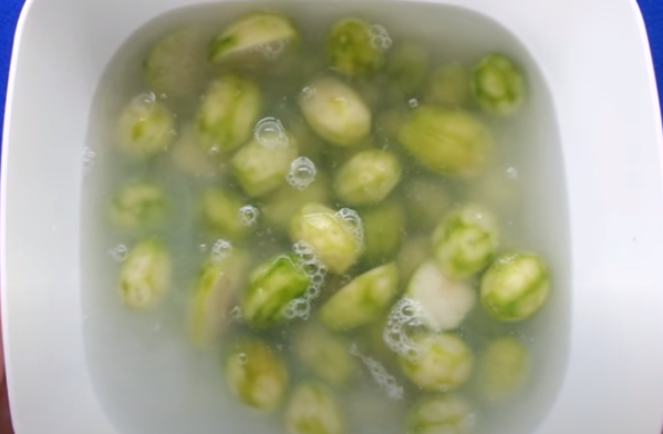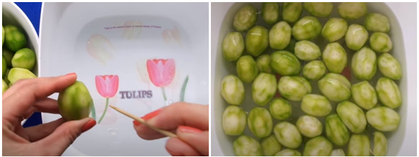 Bước 1: Chuẩn bị 1 tô nước, thêm vào 10g muối. Dùng xiên que đâm xung quanh quả cóc rồi cho vào tô nước muối ngâm 15 - 20 phút. Sau đó vớt cóc ra.
