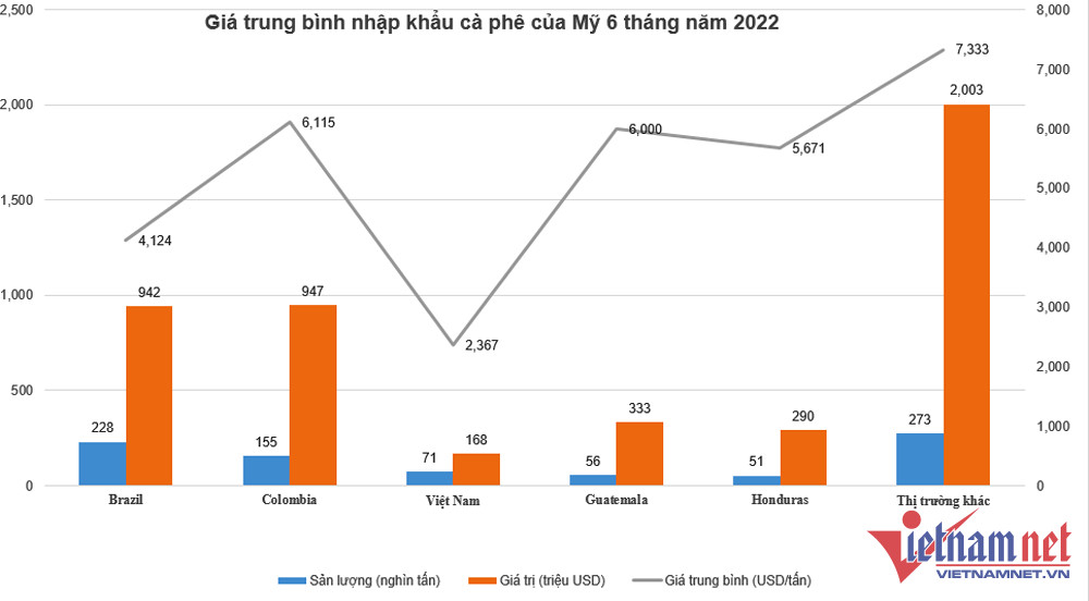 Brazil và Colombia là hai nhà cung cấp cà phê chính cho Mỹ, Việt Nam xếp vị trí thứ 3. Trong 6 tháng năm 2022, Mỹ chi 168 triệu USD nhập khẩu gần 71.000 tấn cà phê từ Việt Nam, tăng 7,8% về lượng và tăng 39,1% về trị giá so với cùng kỳ năm ngoái. Thị phần cà phê của Việt Nam trong tổng lượng nhập khẩu của Mỹ tăng từ 8,32% lên 8,51%.