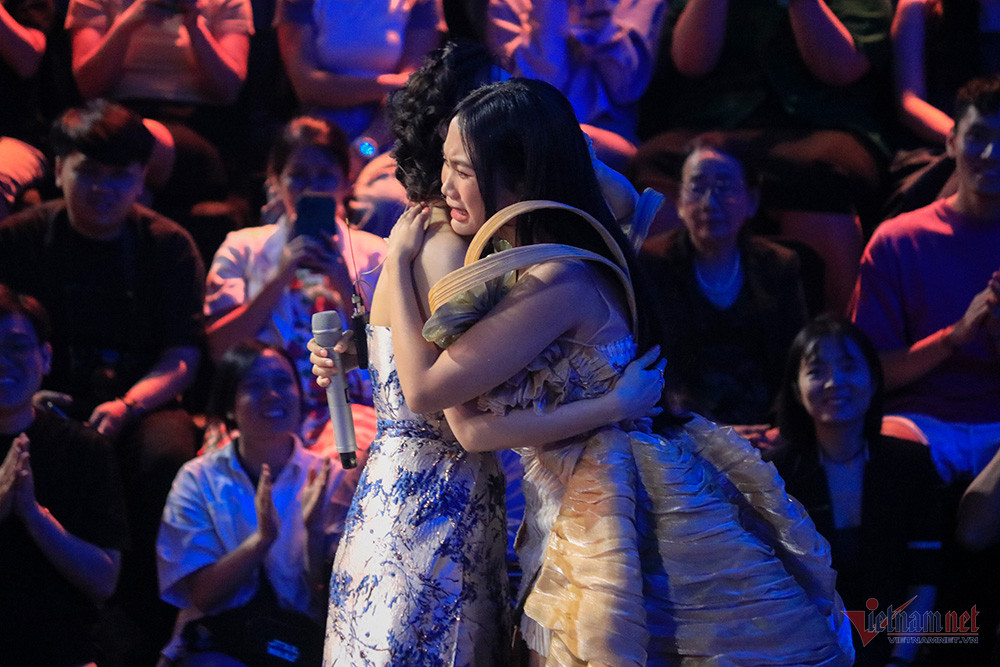 Ca sĩ khách mời đêm liveshow 6 - Phương Mỹ Chi xúc động bật khóc khi được ôm bộ ba giám khảo.