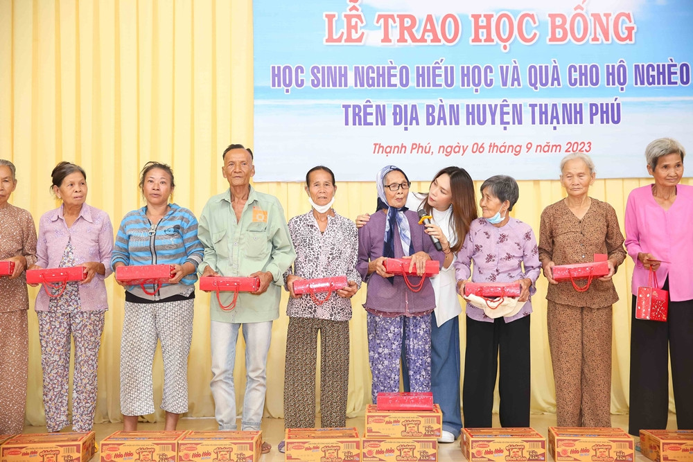Dịp này, Mỹ Tâm và quỹ cũng trao thêm 200 phần quà cho các gia đình khó khăn ở huyện Thạnh Phú, tỉnh Bến Tre. Mỗi phần quà bao gồm 300 nghìn đồng tiền mặt, bánh trung thu và 1 thùng mì với mong muốn chia sẻ khó khăn và động viên các gia đình vượt lên hoàn cảnh, có cuộc sống tốt đẹp, vui vẻ và như ý.