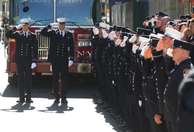 | Lính cứu hỏa tại New York mặc niệm tưởng nhớ các nạn nhân. Ảnh: USA Today |