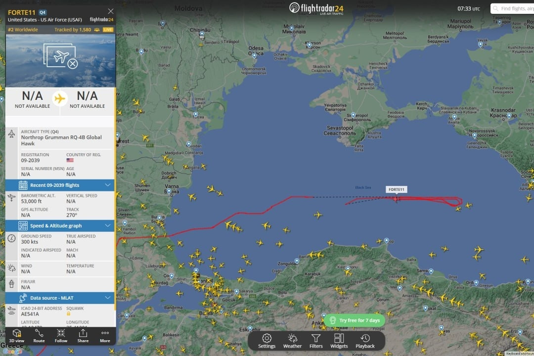 Phía Nga bày tỏ quan ngại trước việc UAV phương Tây thường xuyên hoạt động ở Biển Đen nhằm thu thập dữ liệu tình báo để chuyển cho quân đội Ukraine, phục vụ các cuộc tấn công nhắm vào lực lượng và hạ tầng của Nga. Quân đội Nga nhiều lần triển khai tiêm kích chặn trinh sát cơ và UAV phương Tây bay gần biên giới nước này.