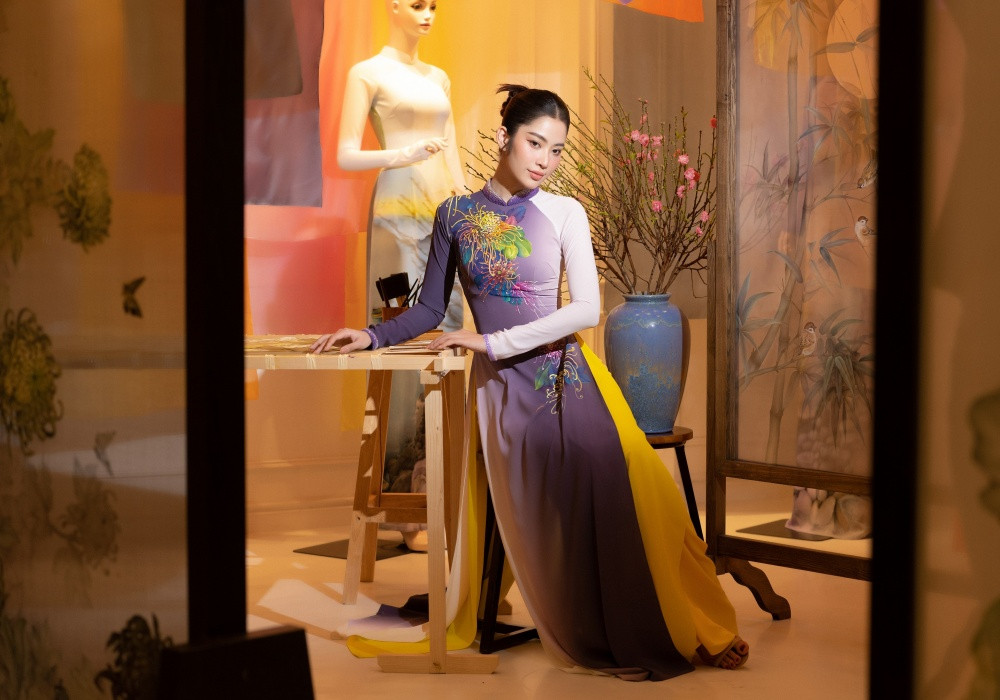 Ngoài những mẫu thiết kế trên lụa nhuộm ombre chuyển màu ấn tượng, nhà thiết kế - nghệ nhân Trung Đinh còn ứng dụng kỹ thuật vẽ trên lụa để biến những tà áo dài thêm nhiều màu sắc.