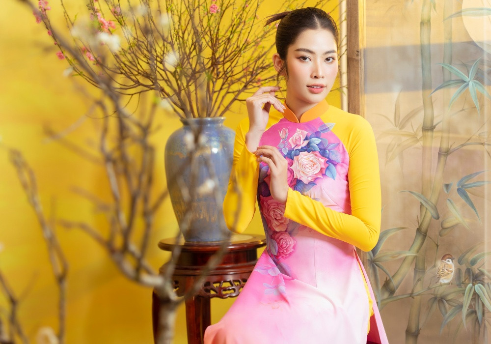 Trung Đinh vẫn trung thành với phom dáng áo dài truyền thống, tôn lên vóc dáng người phụ nữ Việt. Thêm điểm nhấn của bộ sưu tập này được nhà thiết kế thiết kế mỗi tà có 2 lớp. Tà bên trong đơn sắc và có sự liên kết về màu sắc với tranh, đây là sự tinh tế của nhà thiết kế.