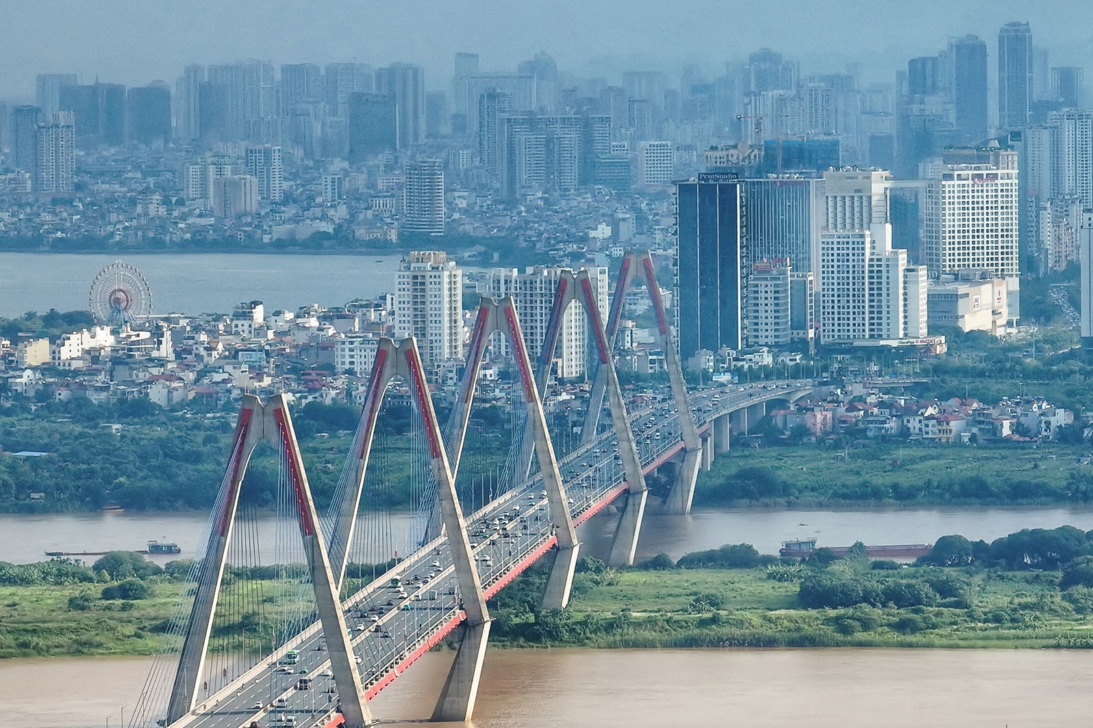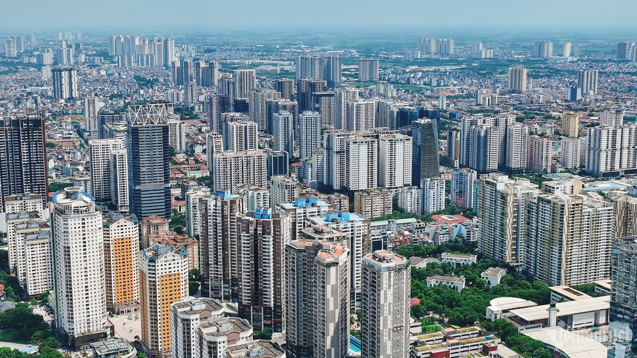 Hình ảnh nhìn từ khu vực cầu Nhật Tân, cửa ngõ từ sân bay quốc tế Nội Bài ra vào trung tâm Thủ đô, từ trên cao có thể thấy rõ sự dày đặc của các tòa nhà.