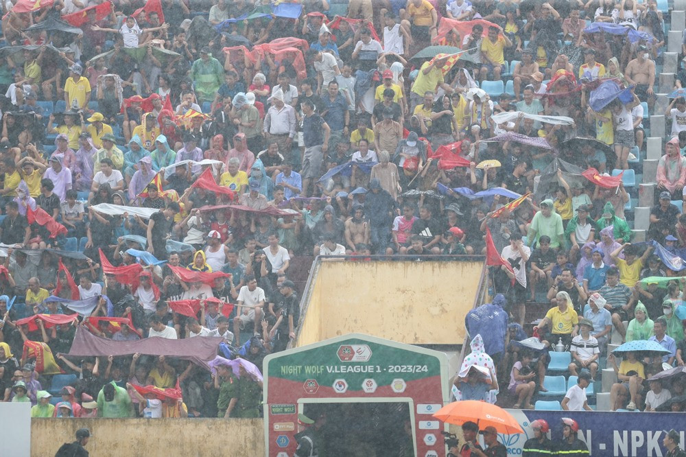Sân Thiên Trường: Trời đổ mưa rào, ảnh hưởng đến lối chơi của hai đội. Trên khán đài, CĐV thành Nam đã phải đội mưa để cổ vũ cho các cầu thủ dưới sân.
