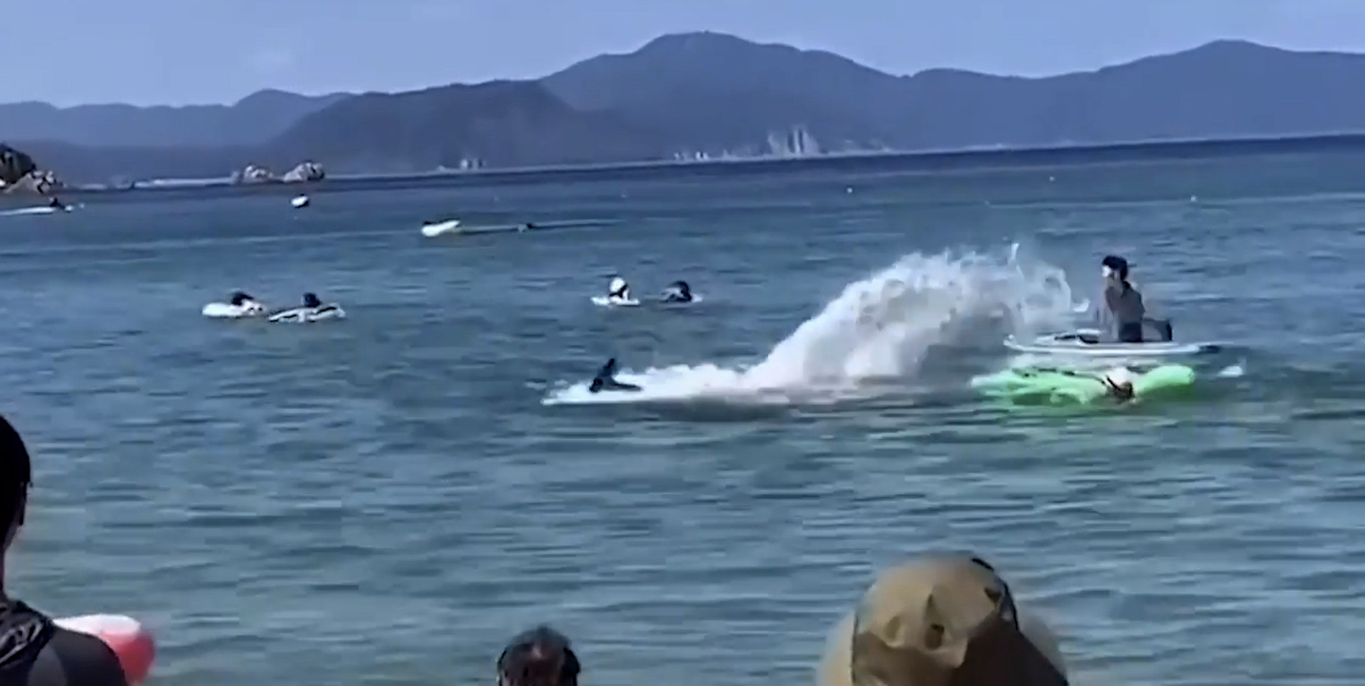 Hình ảnh được một du khách đứng trên bờ biển ghi lại cho thấy, một người đàn ông đang cố gắng bơi vào bờ sau khi bị một con cá heo truy đuổi. Chỉ vài giây sau, con cá heo bất ngờ lao lên khỏi mặt nước và nhấn chìm nam du khách.