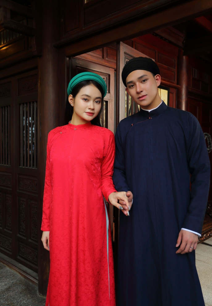Bên cạnh các sắc trơn thuần khiết, một số áo được thêu hoa văn họa tiết theo phong cách cung đình Huế, đưa người mặc trở về một thời y quan rực rỡ của triều Nguyễn.