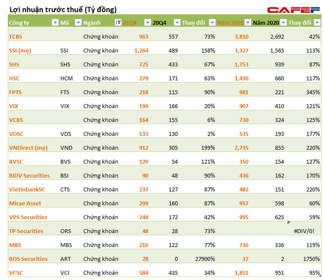 Hàng loạt các công ty chứng khoán báo lãi kỷ lục kể từ khi thành lập. Năm 2021, lợi nhuận trước thuế của công ty mẹ Chứng khoán SSI cán mốc 3.327 tỷ đồng, tăng 113% - tương đương một ngân hàng quy mô vừa tại Việt Nam. Riêng quý 4, công ty mẹ SSI đã lãi 1.264 tỷ đồng.