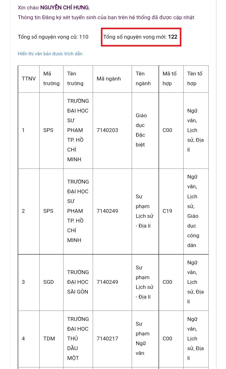 Đây là Nguyện vọng 1 và cũng là nguyện vọng yêu thích nhất của Hưng.
