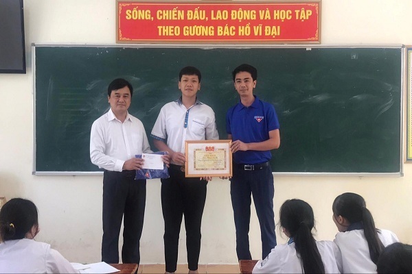 | Thị đoàn Ba Đồn trao giấy khen, tuyên dương nam sinh Nguyễn Tiến Bắc (đứng giữa) |