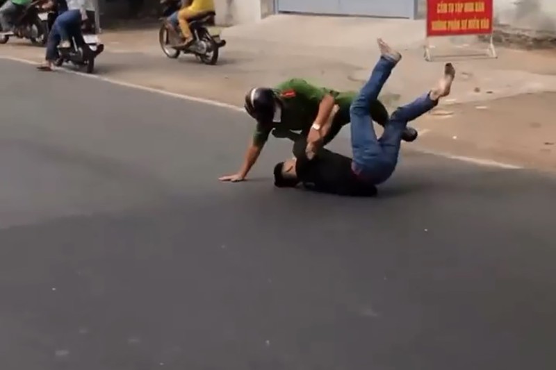 Người cán bộ công an đã khéo léo tránh những đòn tấn công thẳng tay từ Hiếu. Ảnh chụp từ clip |