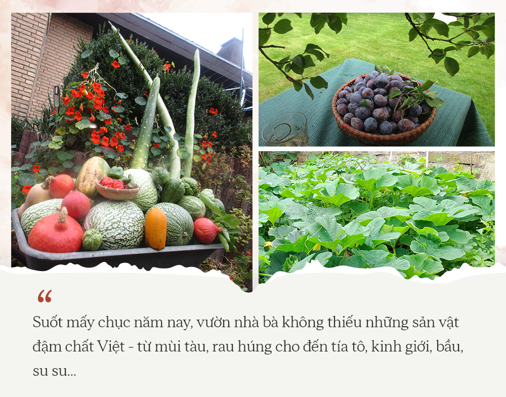 Suốt mấy chục năm nay, vườn nhà bà không thiếu những sản vật đậm chất Việt - từ mùi tàu, rau húng cho đến tía tô, kinh giới… Vườn hoa của bà cũng có đủ các loài hoa đặc trưng cho Tết Việt: thủy tiên, lay-ơn, thược dược, mai, đào…, thậm chí còn nhiều màu sắc và rực rỡ hơn cả ở Việt Nam.