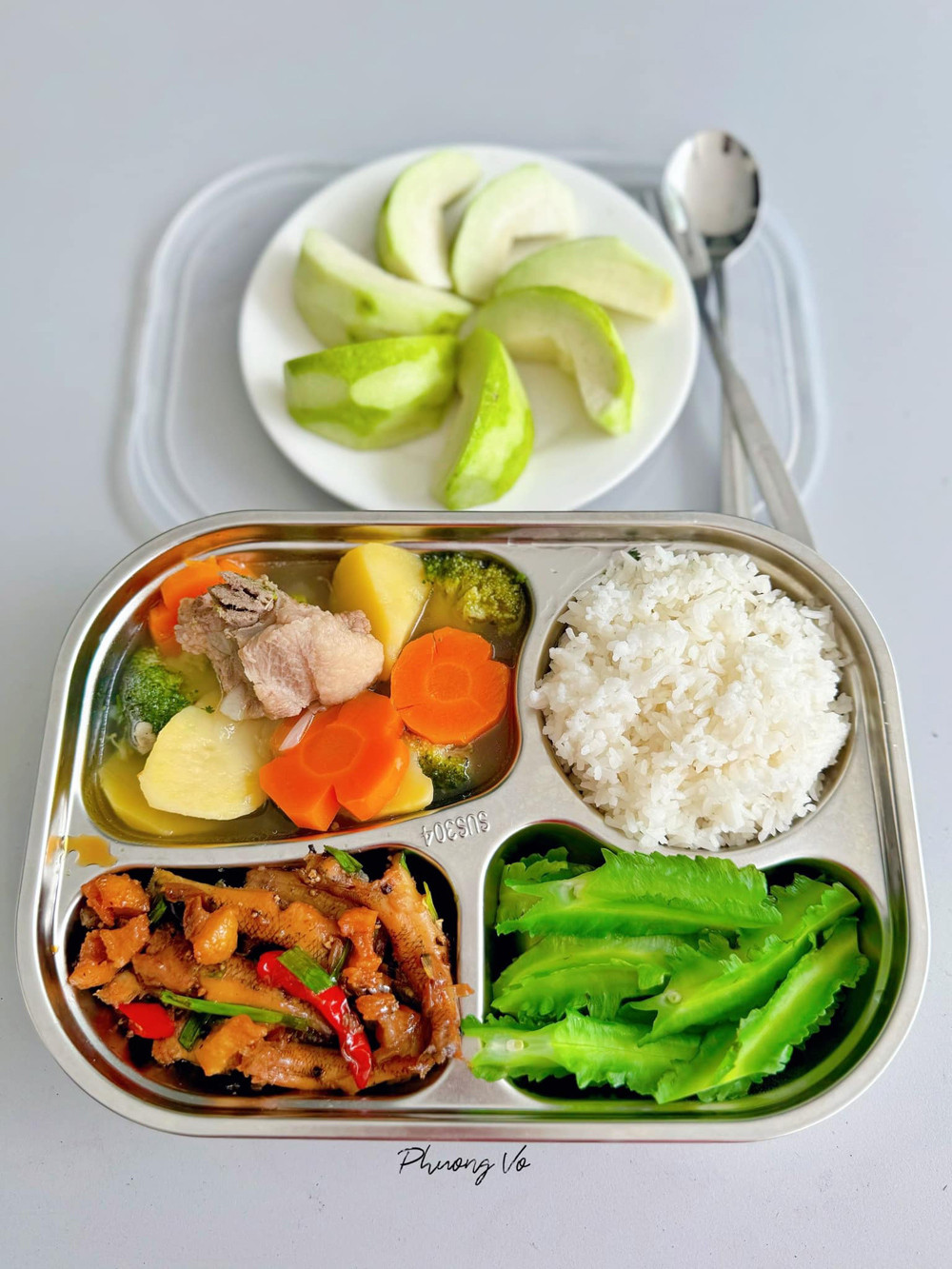 “Mỗi khay ăn, mẹ tôi thường ưu tiên đủ đạm, tinh bột, củ quả hầm để tăng dinh dưỡng. Còn lại, các món rau khác mẹ luộc cho tôi ăn đỡ ngấy”, Phương nói.