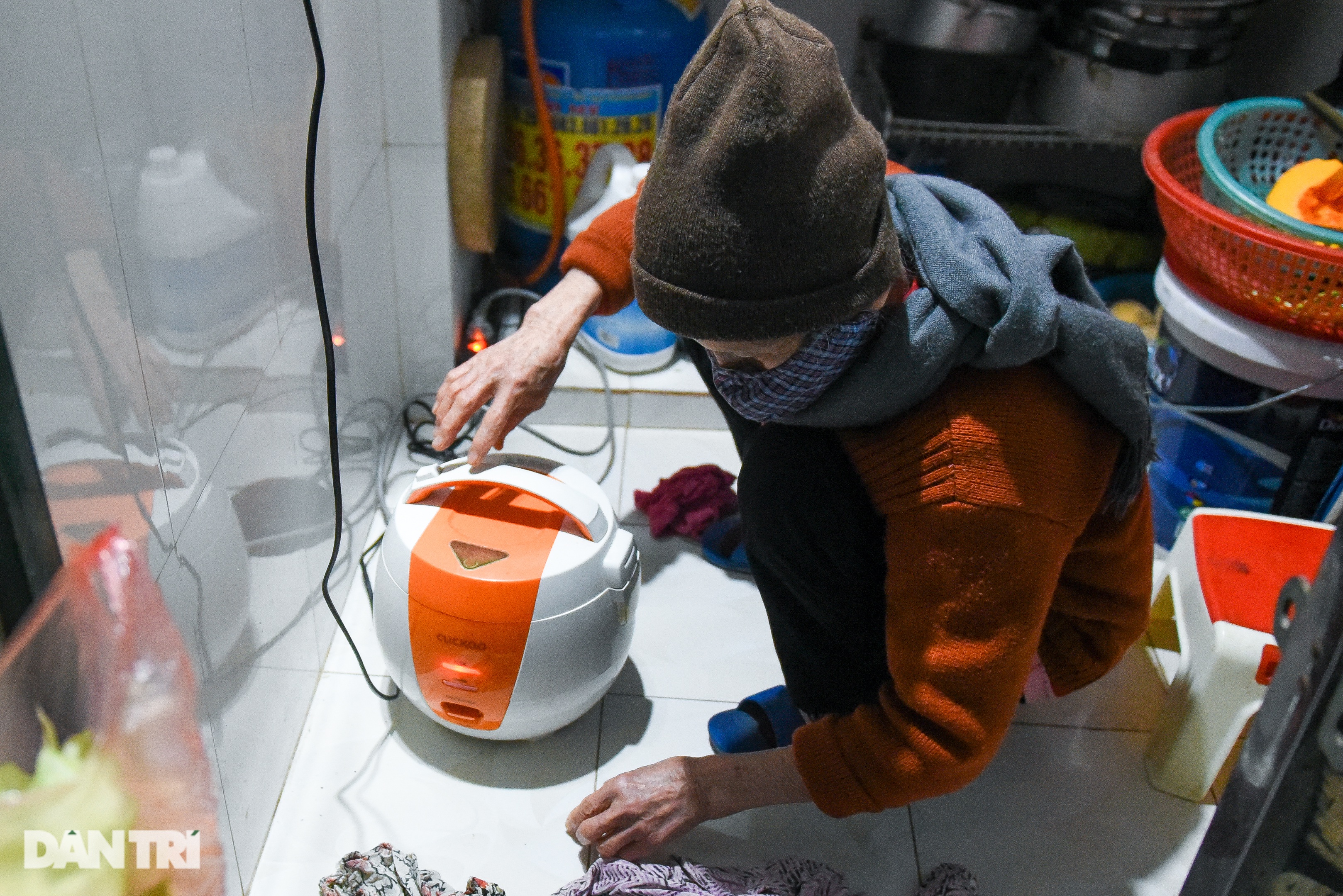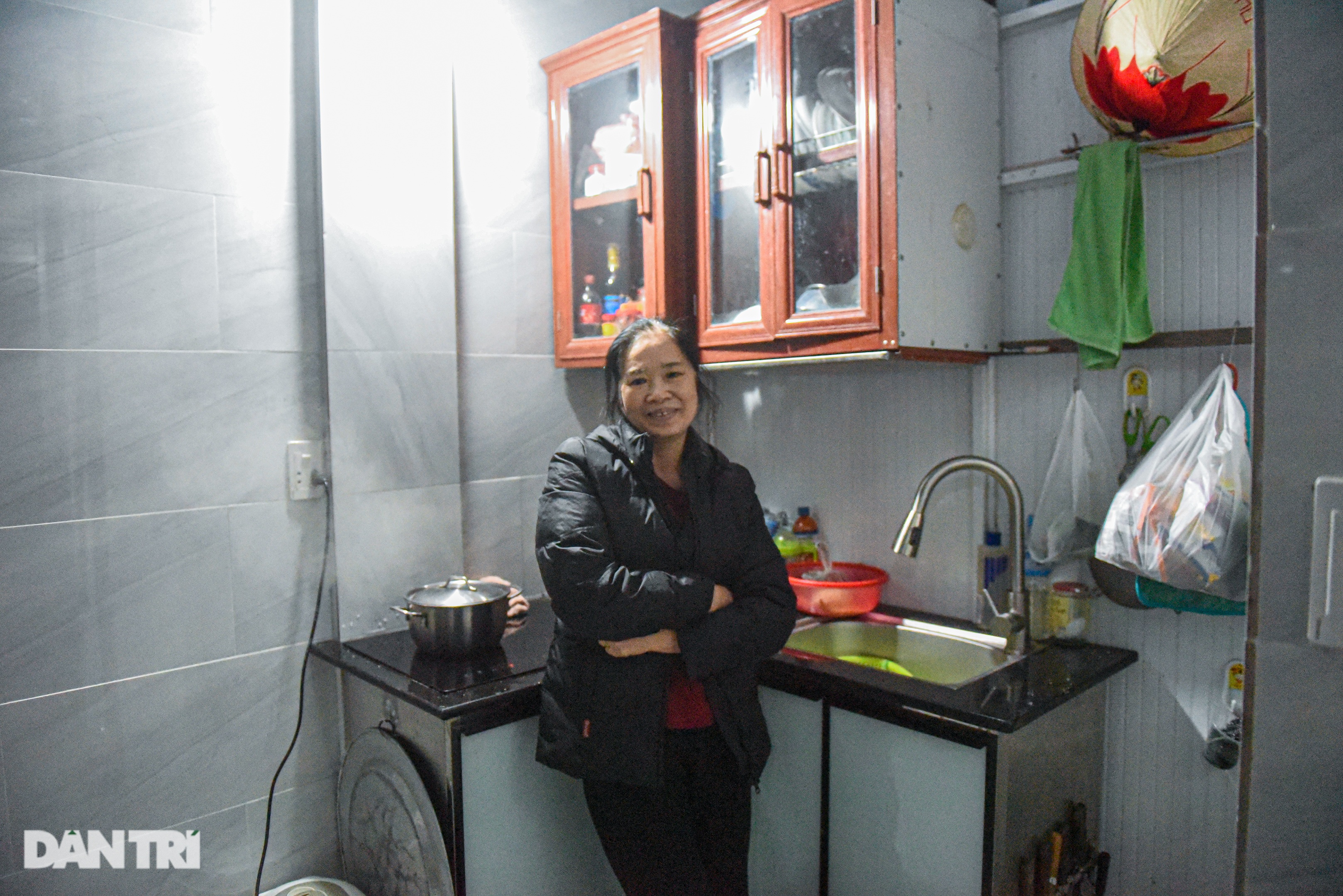 Căn bếp nhà bà chỉ chừng 1 m2, đủ đặt bếp ga, giá đựng bát nho nhỏ, bình nước và nồi cơm điện. "Từ quê lên đây sinh sống, ban đầu, tôi không quen. Quê tôi vốn rộng rãi lắm. Cuộc sống buộc tôi phải thích nghi. Hơn 5 thập kỉ sống ở đây rồi, tôi quen dần, không muốn đi đâu nữa", bà Thu chia sẻ.