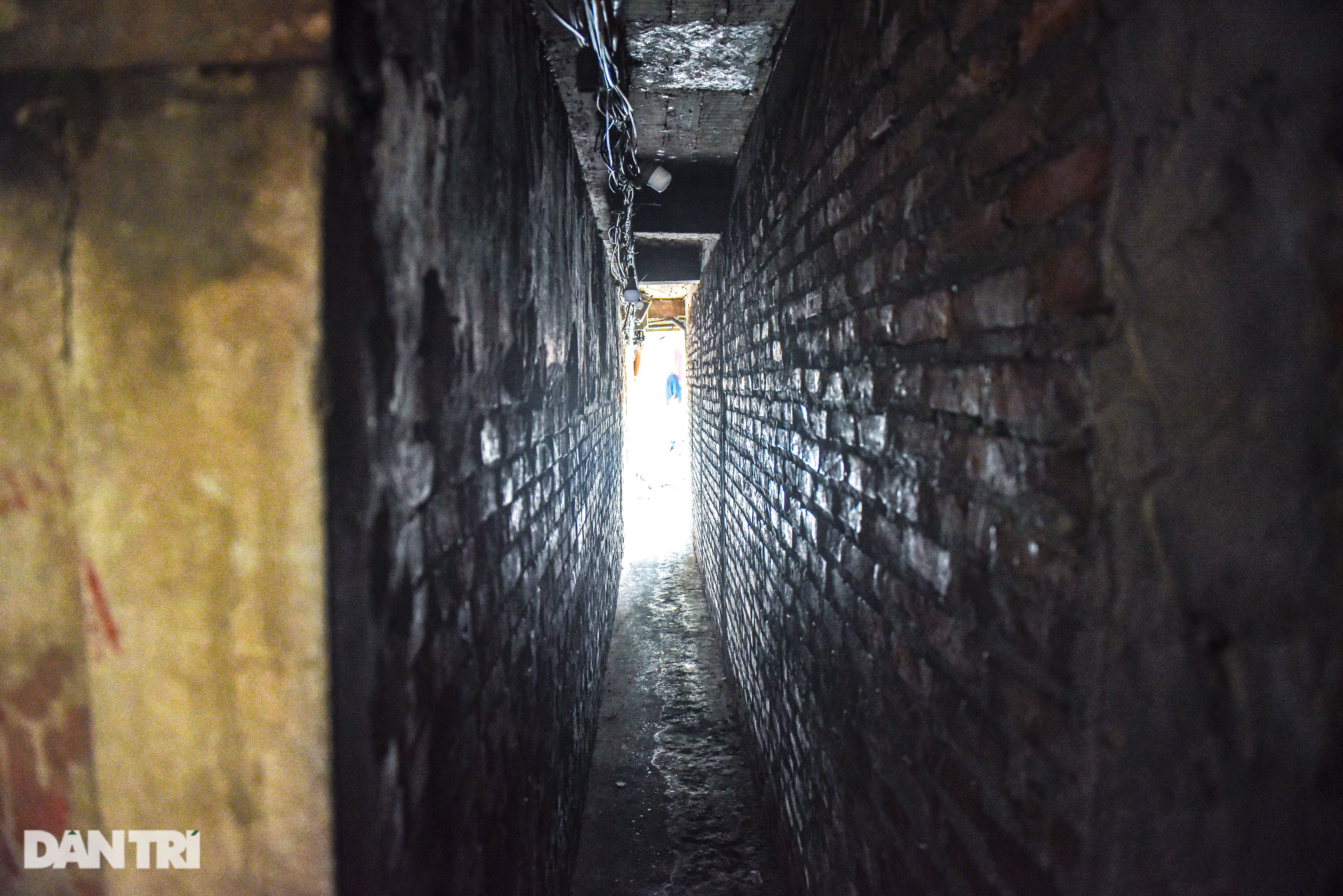 Trong hình là một con ngõ nhỏ, chỉ rộng tầm 70 - 80 cm ở phố Hàng Chiếu. Con ngõ cũ kĩ, xuống cấp, hai bên tường bong tróc, trái ngược hoàn toàn với cảnh sầm uất, hiện đại phía ngoài. Cuộc sống của các hộ dân tại đây gặp không ít khó khăn vì sự chật chội.