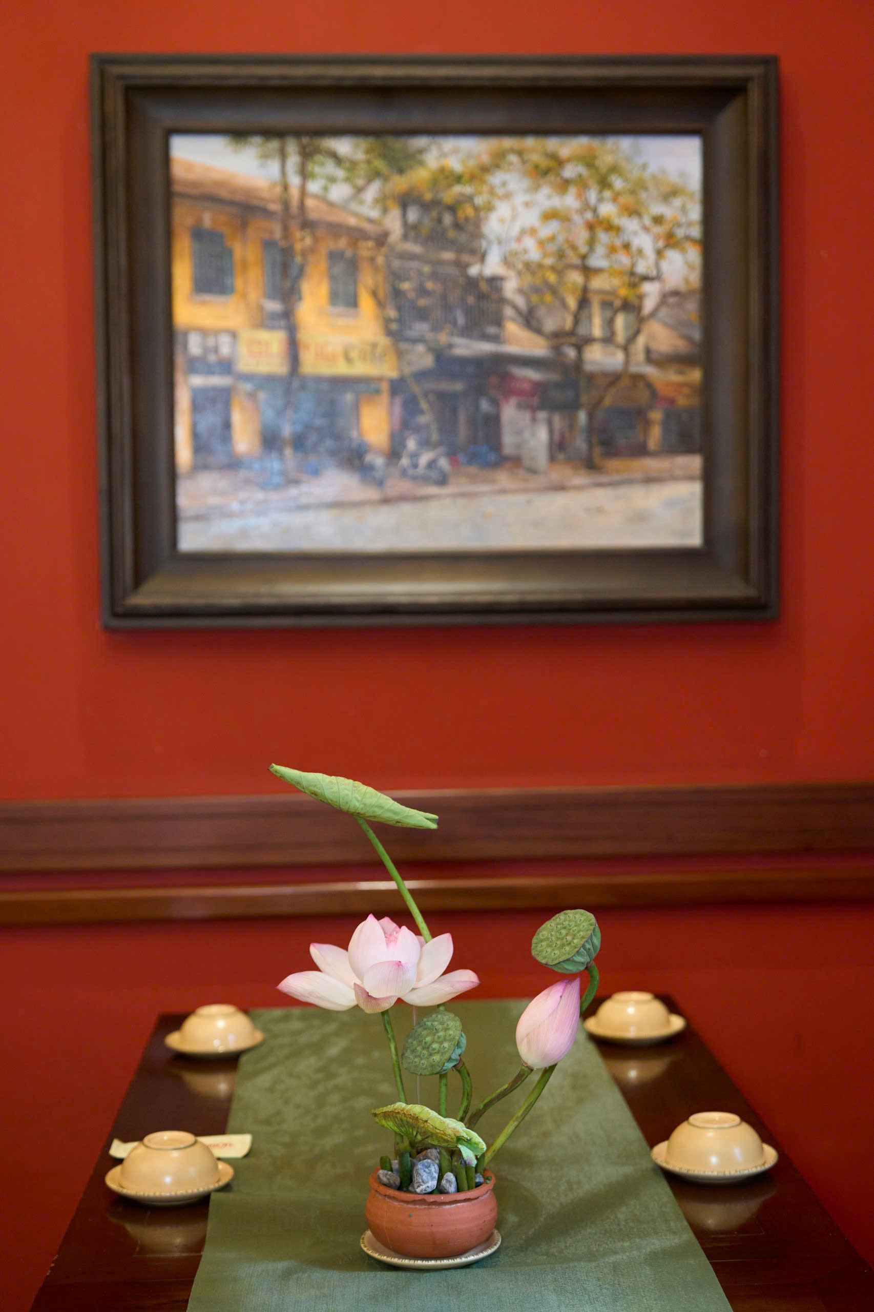 Không gian của workshop ngập tràn sắc sen và hương sen: từ con đường sen với những cánh hoa hồng khẽ lay trong bình gốm đến nụ sen xanh mướt đặt cạnh mâm cỗ... Từng góc nhỏ đều gợi nhắc về một Hà Nội mùa hạ xưa cũ, thanh khiết và lắng đọng.